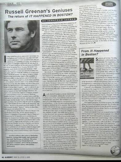 LA Weekly, WLS, May 30-June 2003 “Russell Greenan’s Geniuses: The return of It Happened in Boston?” ©Jonathan Lethem |