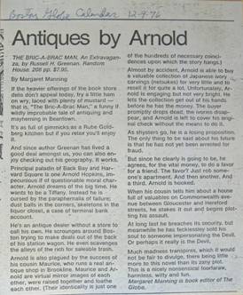 “If the heavier offerings of the book store delis don’t appeal today, try a little ham on wry, laced with plenty of mustard—that is, ‘The Bric-a-Brac Man’, a funny if wildly improbable tale of antiquing and mayheming in Beantown. It’s as full of gimmicks as a Rube Goldberg kitchen, but if you relax you’ll enjoy it.” |