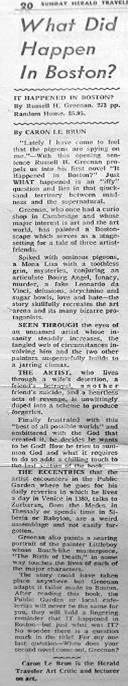 “Spiked with ominous pigeons, a Mona Lisa with a toothless grin, mysteries, conjuring an articulate Bourg angel, lunacy, murder...love and hate… The story could have taken place anywhere but Greenan adapts it tailor made to Boston. After reading this book, the Public Garden or local cafeterias will never be the same for you, they will hold a lingering reminder that IT happened in Boston—but just what was IT? No wonder there is a question mark in the title! For my one last question—When does your second novel come out, Greenan?”